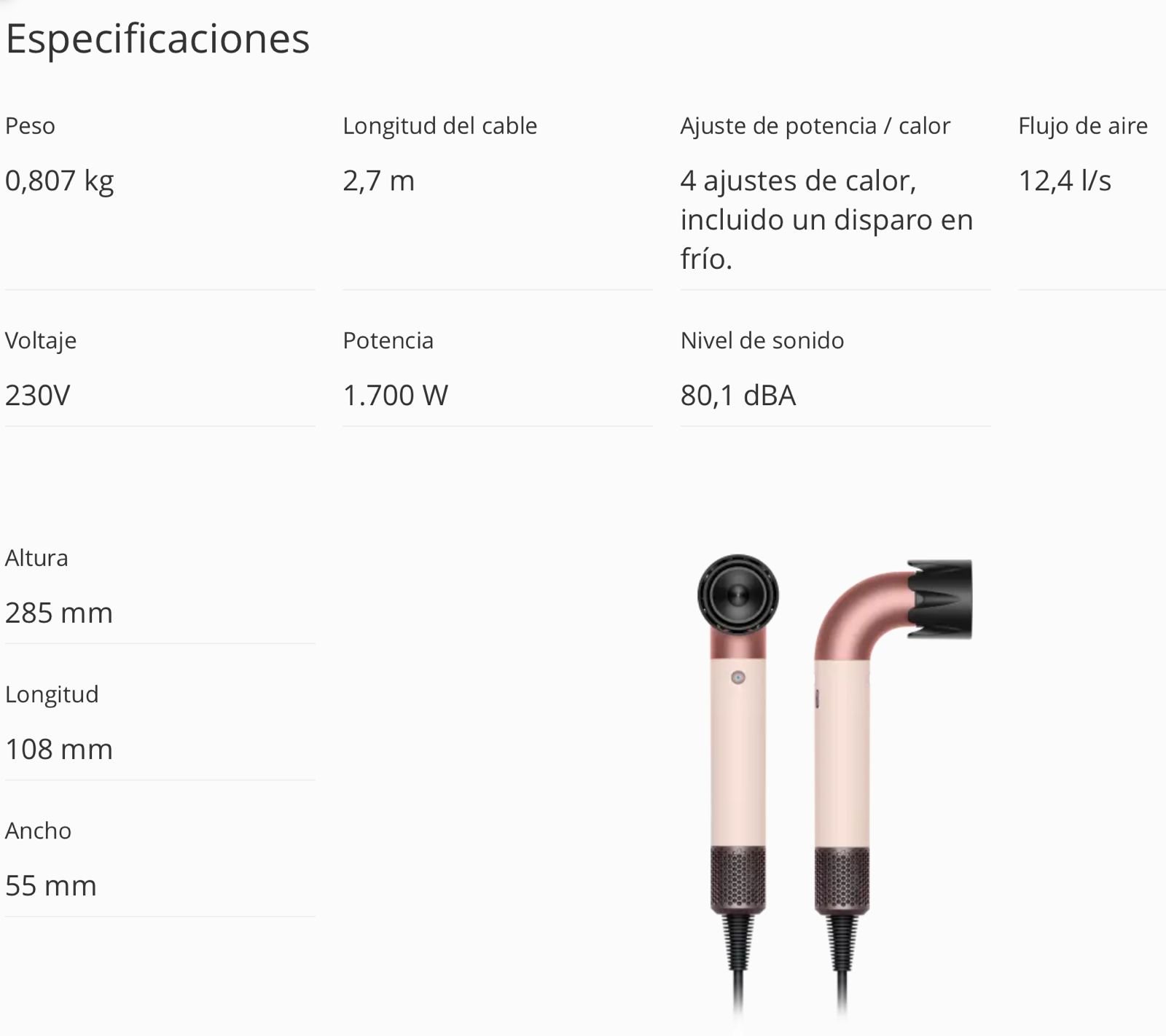 ⁰Vs. Secador de pelo Dyson Supersonic. Basado en el peso corporal.